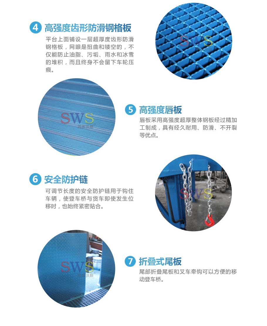 5. 橋體與集裝箱連接處有帶掛鉤的鏈條,使汽車和登車橋緊密連接,保證工作時(shí)的安全可靠性。