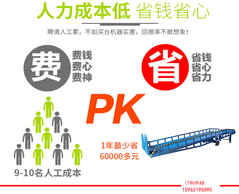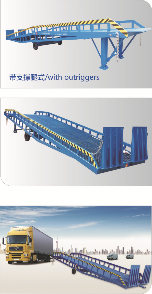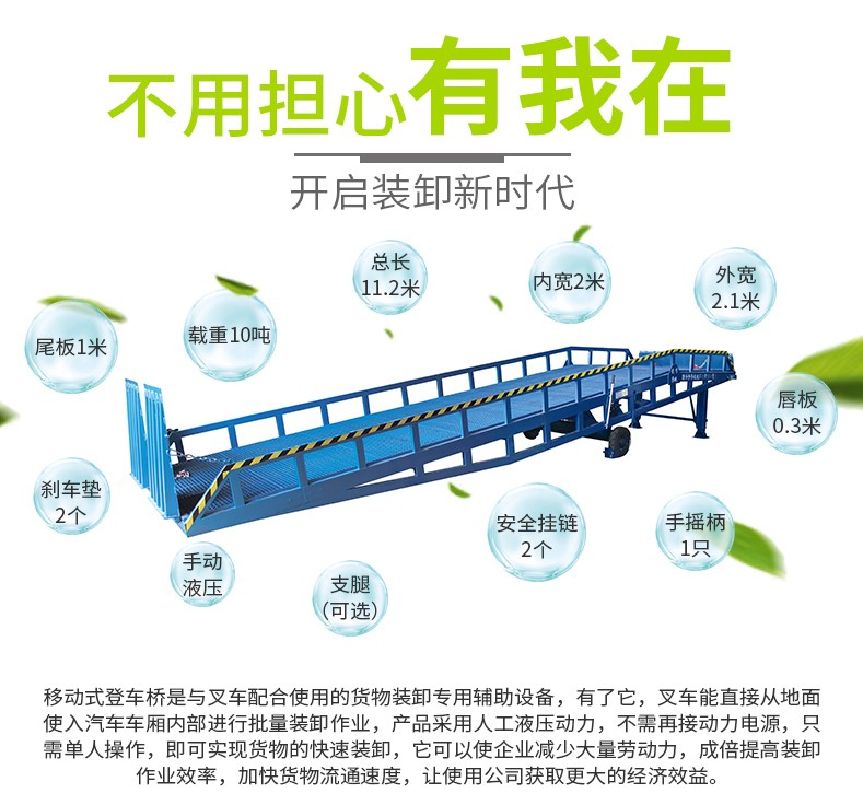 移動(dòng)液壓登車橋是與叉車配合使用的貨物裝卸專用輔助設(shè)備,有了它,叉車能直接從地面進(jìn)入汽車車廂內(nèi)進(jìn)行裝卸貨物的作業(yè)。能夠提高貨物裝卸速度,節(jié)省裝卸工作的時(shí)間以及人力,是您裝卸貨物的得力助手。只需單人操作,不需動(dòng)力電源,即可實(shí)現(xiàn)貨物的安全快速裝卸。移動(dòng)式登車橋用于無(wú)裝卸設(shè)備的貨臺(tái)及流動(dòng)裝卸場(chǎng)所,是與叉車配合使用的貨物裝卸輔助設(shè)備??筛鶕?jù)汽車車廂的高低調(diào)節(jié)高度,叉車可以直接通過(guò)本設(shè)備駛?cè)胲噹麅?nèi)部進(jìn)行貨物的批量裝裝卸。